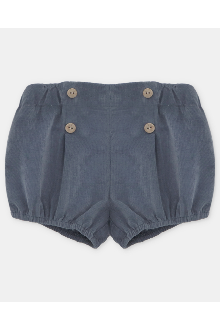 Bombacho de bebé niño de pana con botonadura estética de coco y goma elástica en cintura en azul.