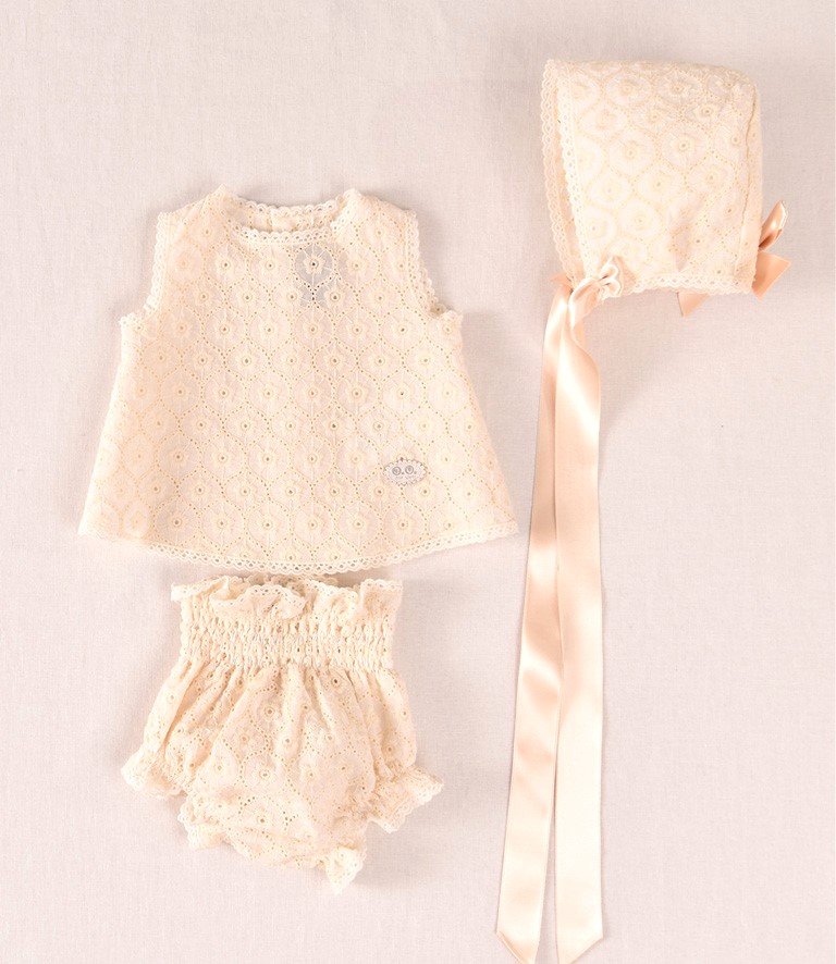 Este es un conjunto de vestido con capota y braguita a juego, confeccionado en tela bordada, destaca por su estilo clásico, atemporal y delicado.