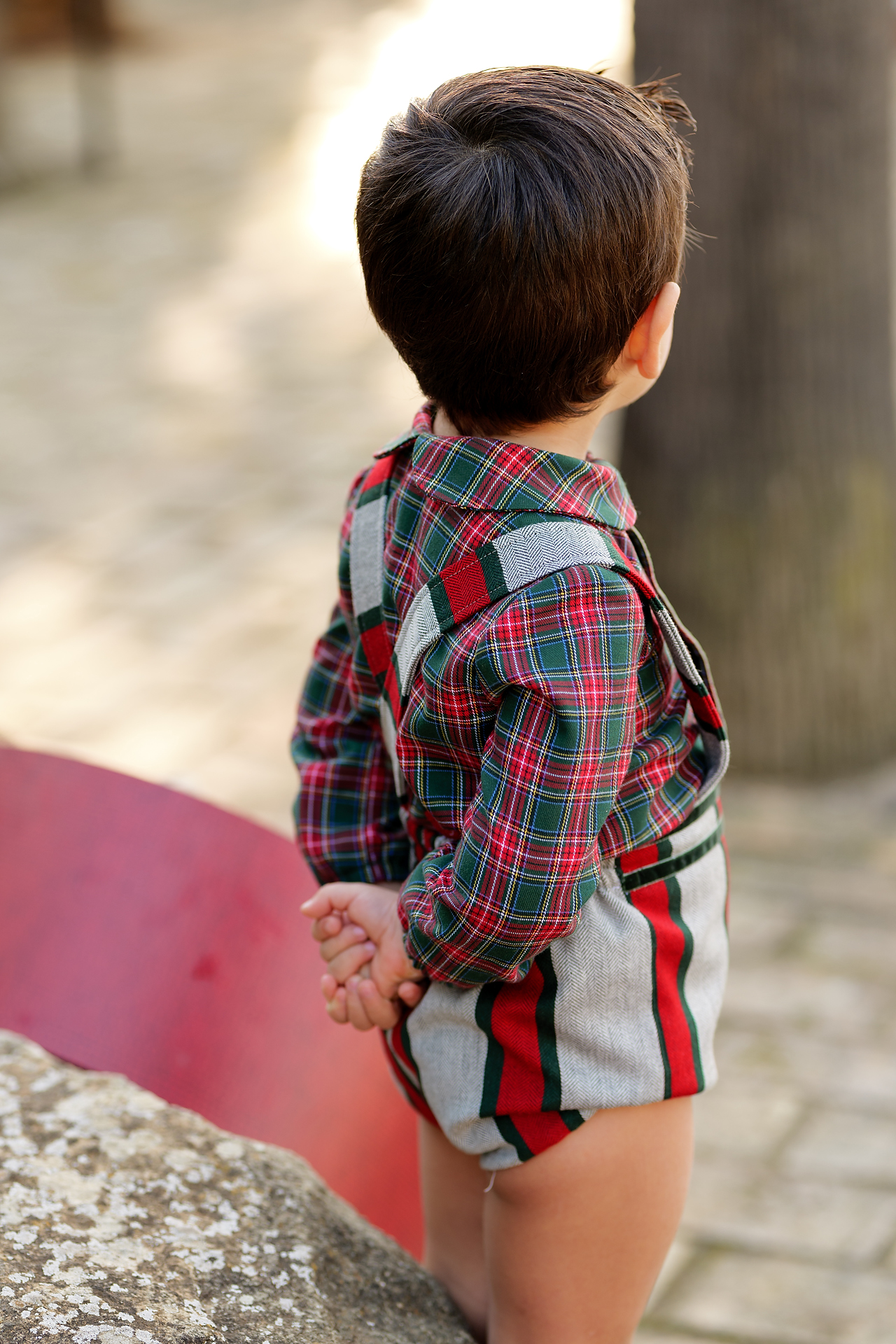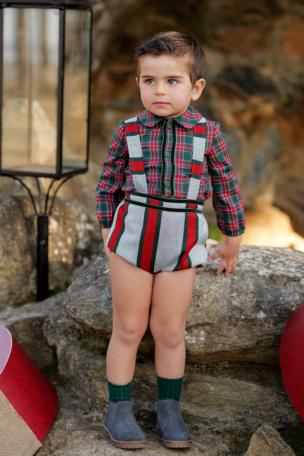 Conjunto de bebé con camisa de cuadros, detalle en terciopelo verde y peto-ranita en tejido de rayas.