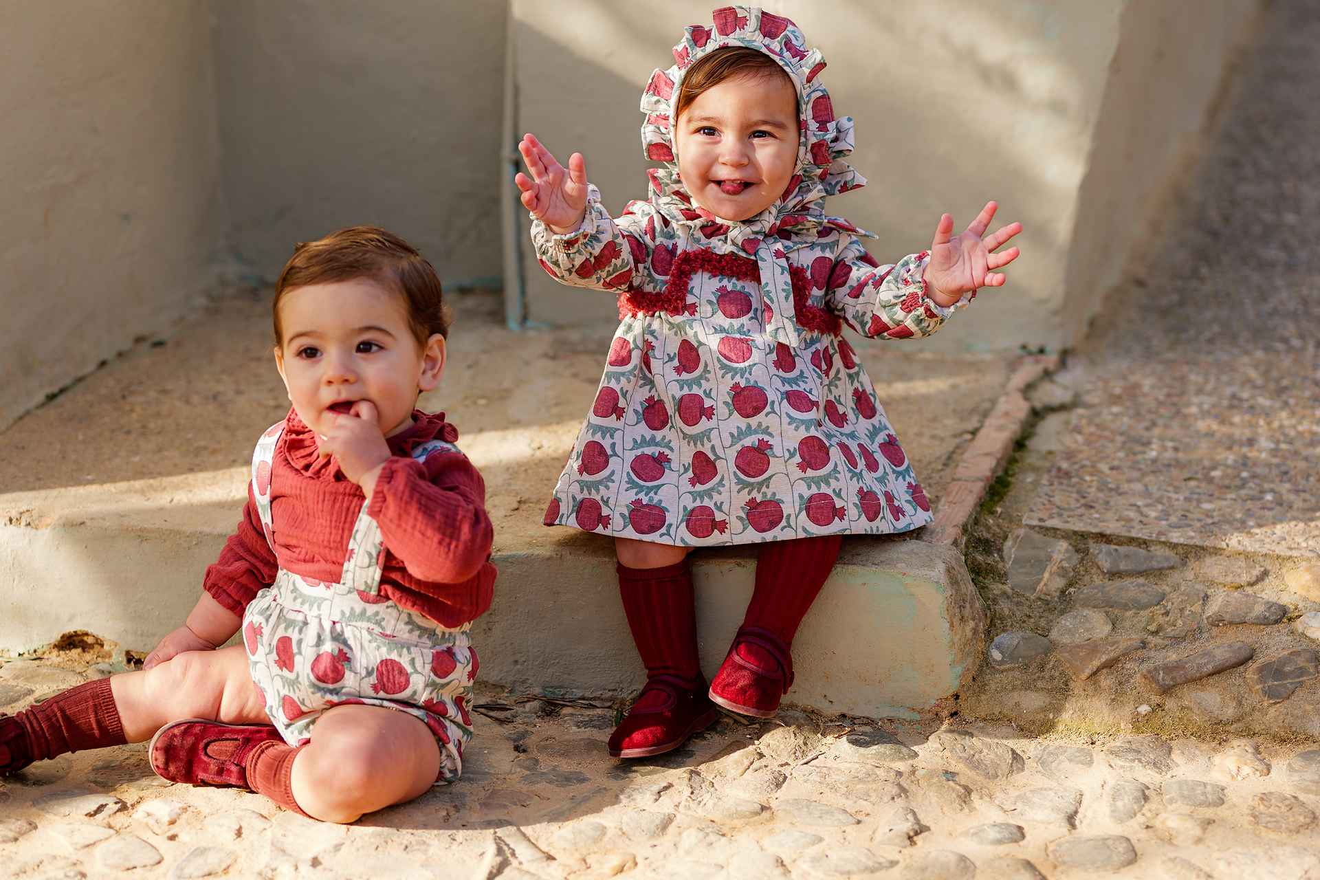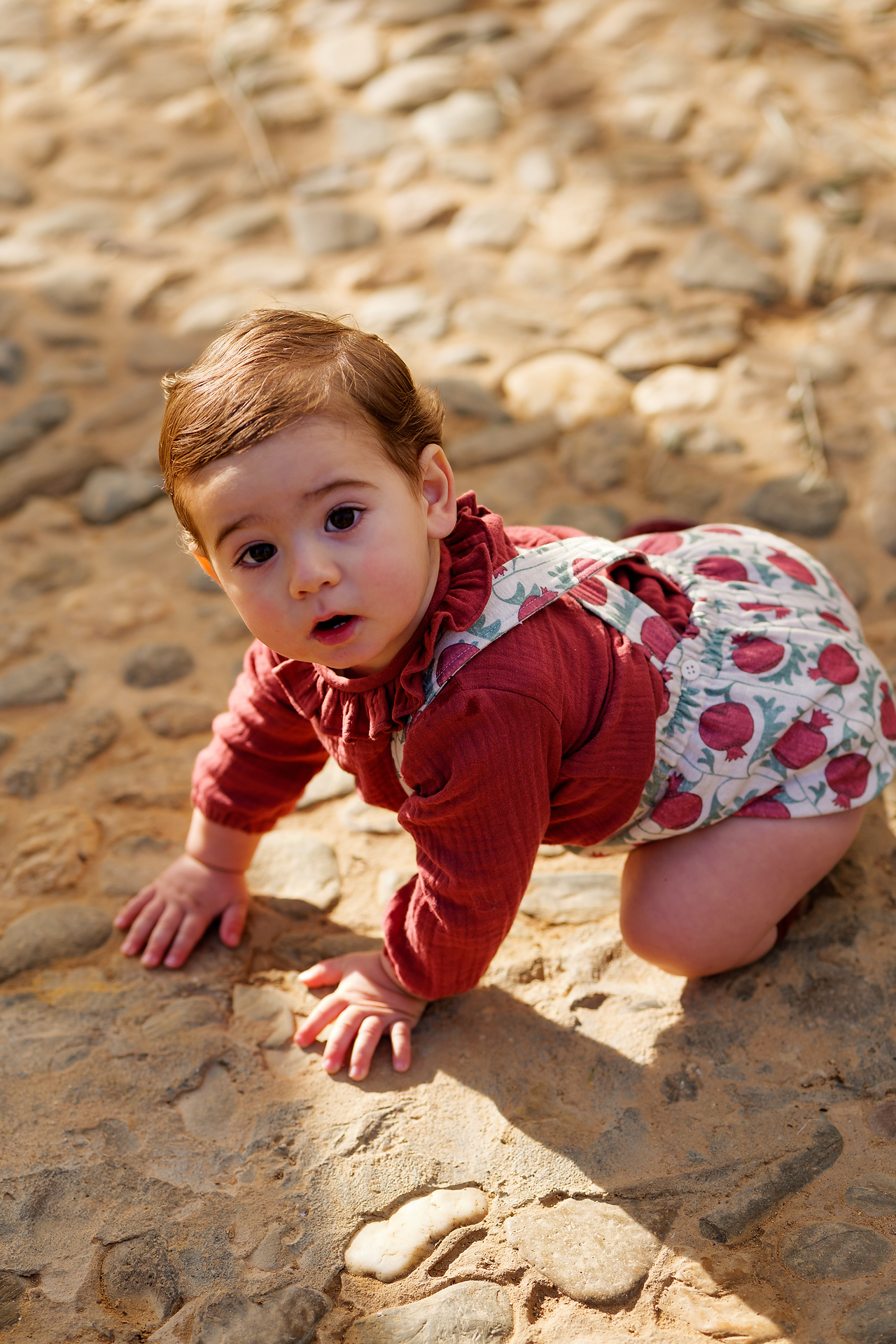 Conjunto de bebé compuesto de peto-ranita con estampado exclusivo y camisa color granate a juego.