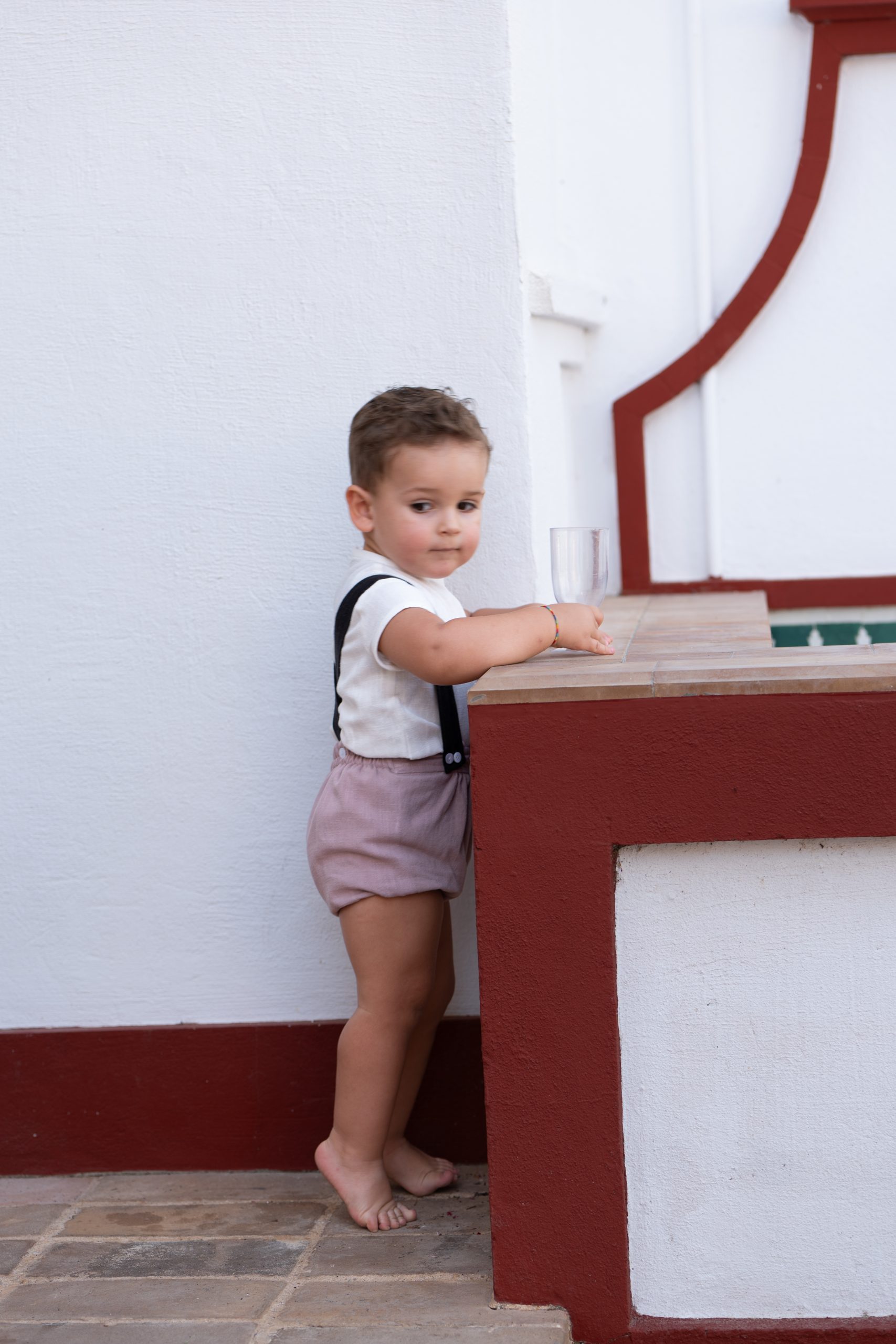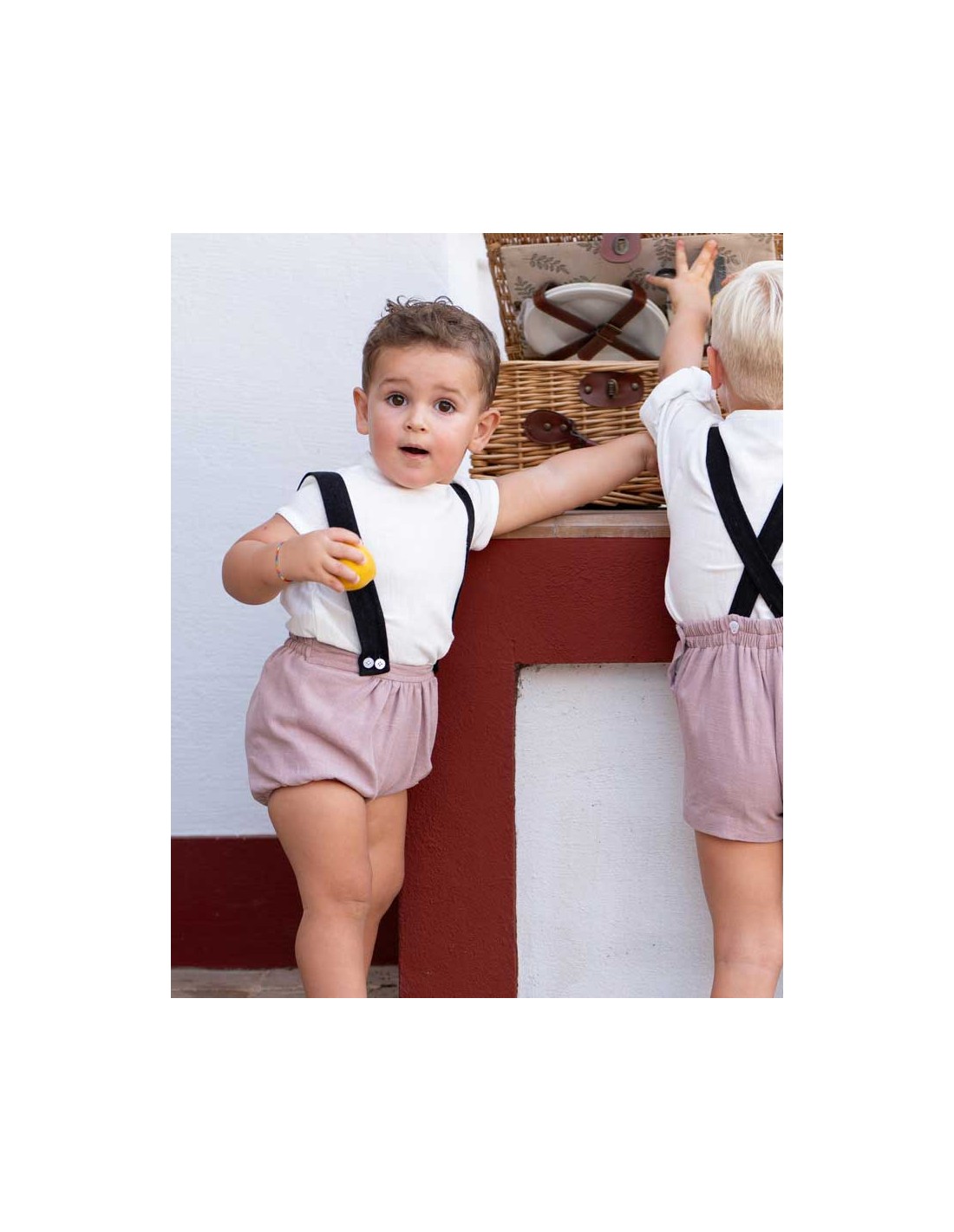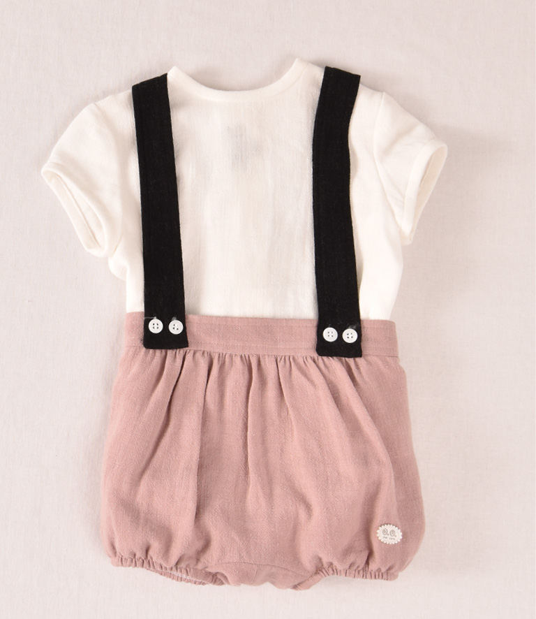 Conjunto de camisa blanca y ranita color lino rosa empolvado con tirantes negros desmontables.