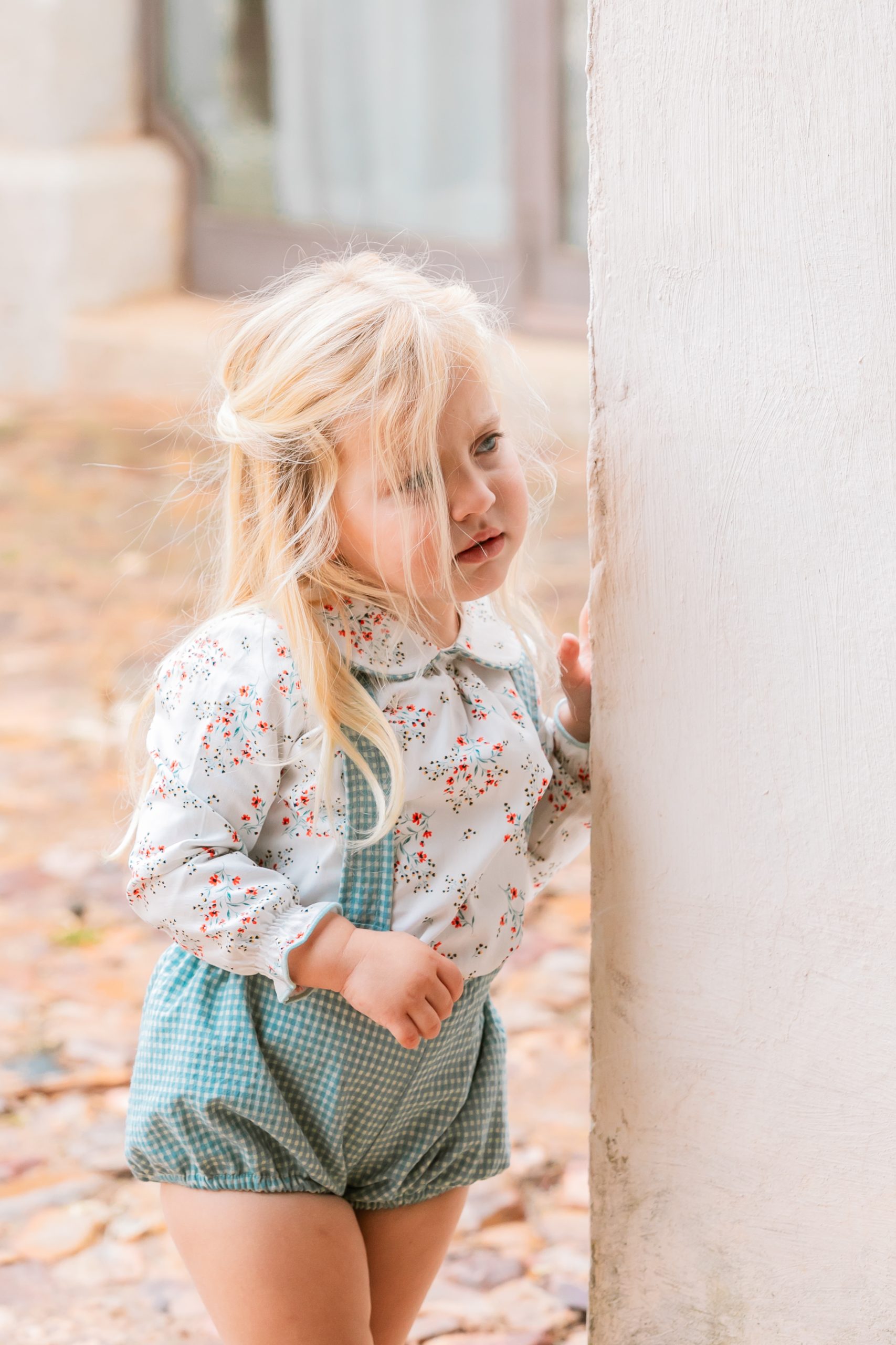 Conjunto camisa cuello bebé colección rama y bombacho vichy tirantes.