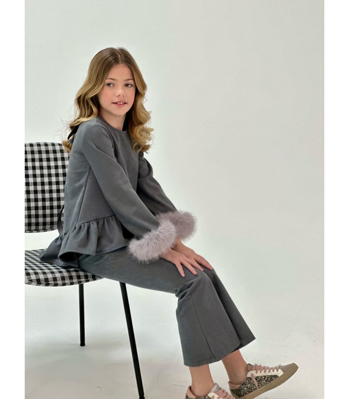 Conjunto gris colección Cloud, puños con pelo gris claro y pantalón campana.