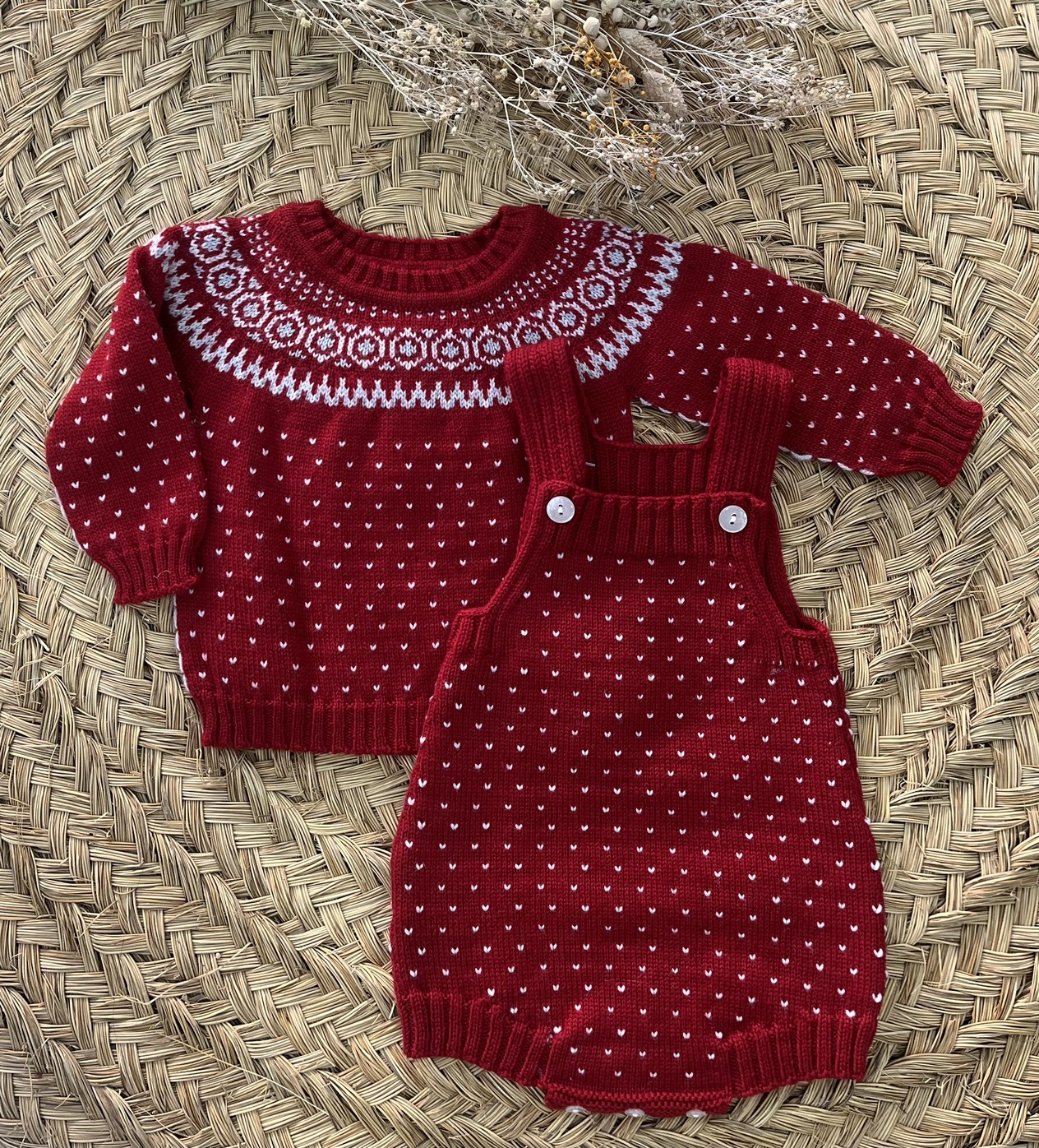 Conjunto de jersey color granate con dibujo de cenefa bordada y corazones blancos, Peto granate con bordado de corazones en blanco y botones para facilitar el cambio de pañal.