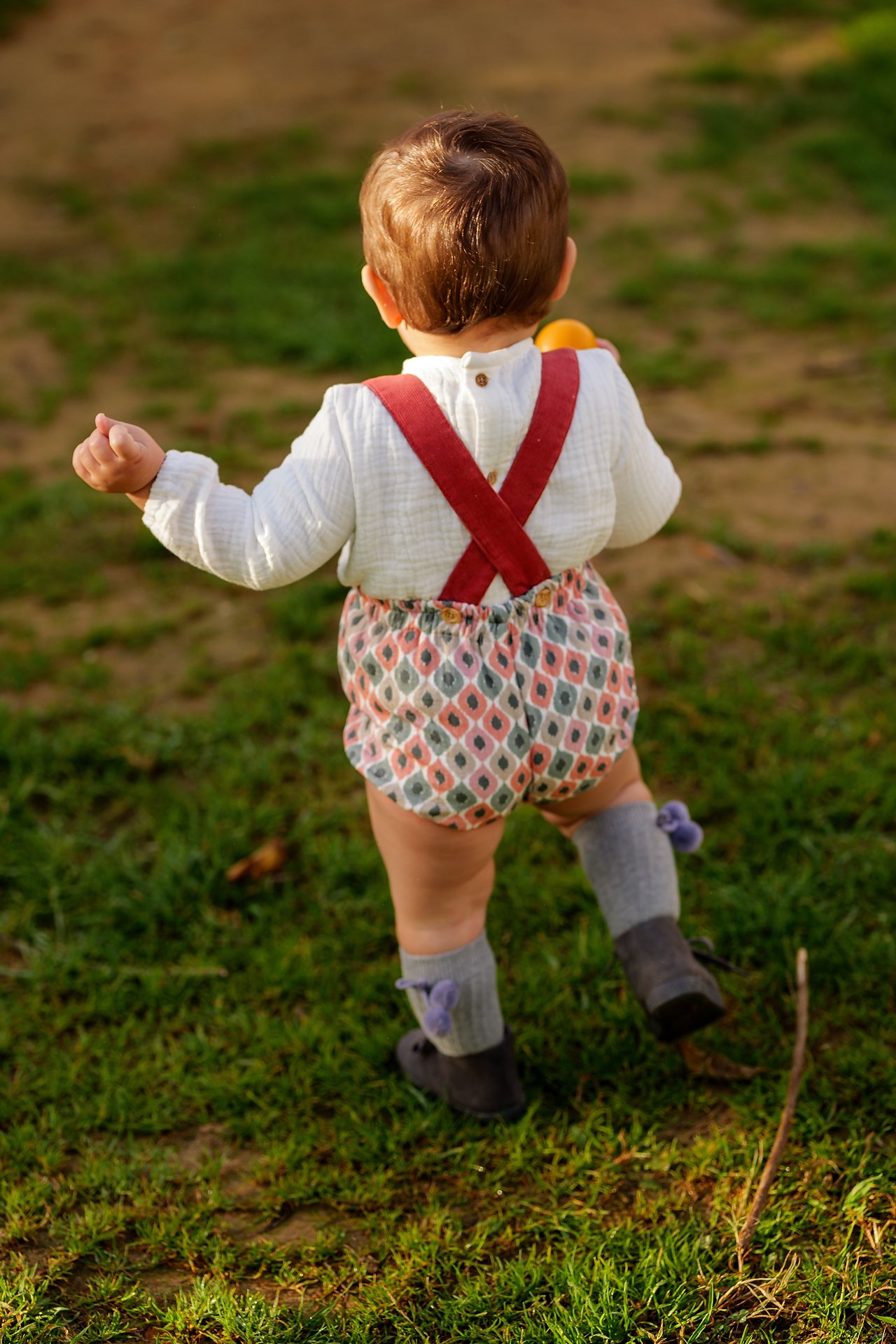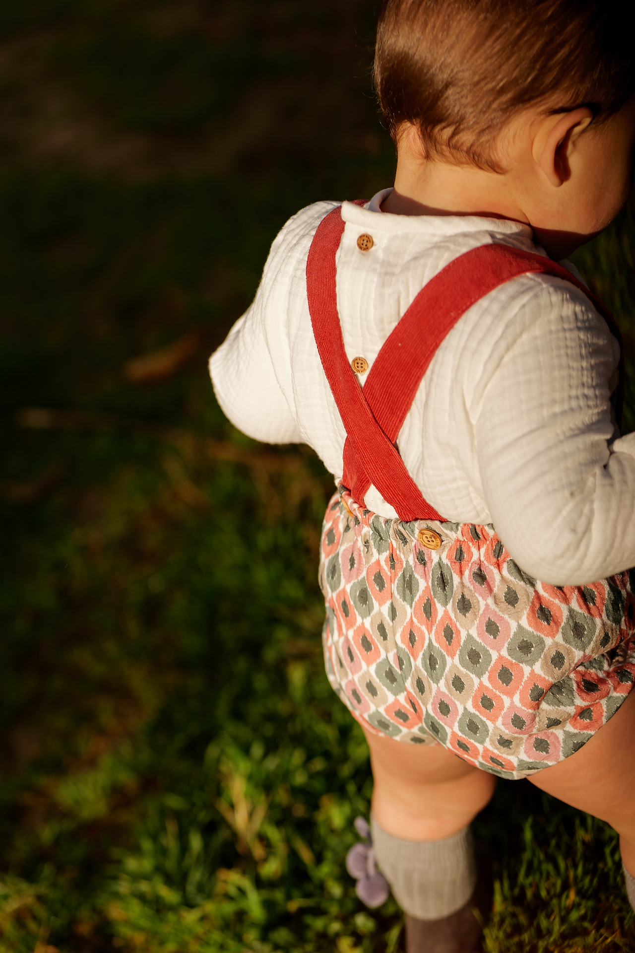 Conjunto de camisa bambula blanca y peto-ranita tejido étnico.