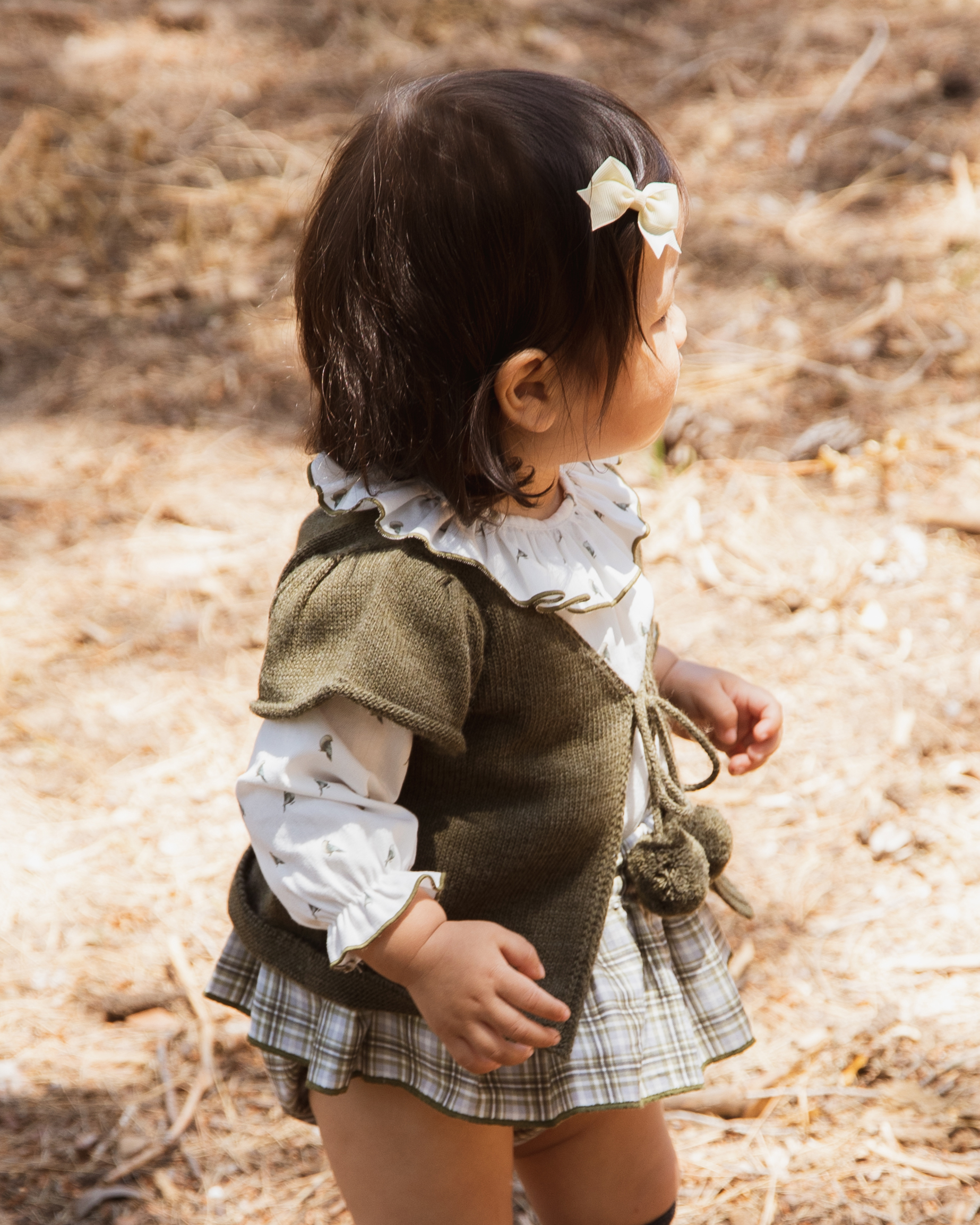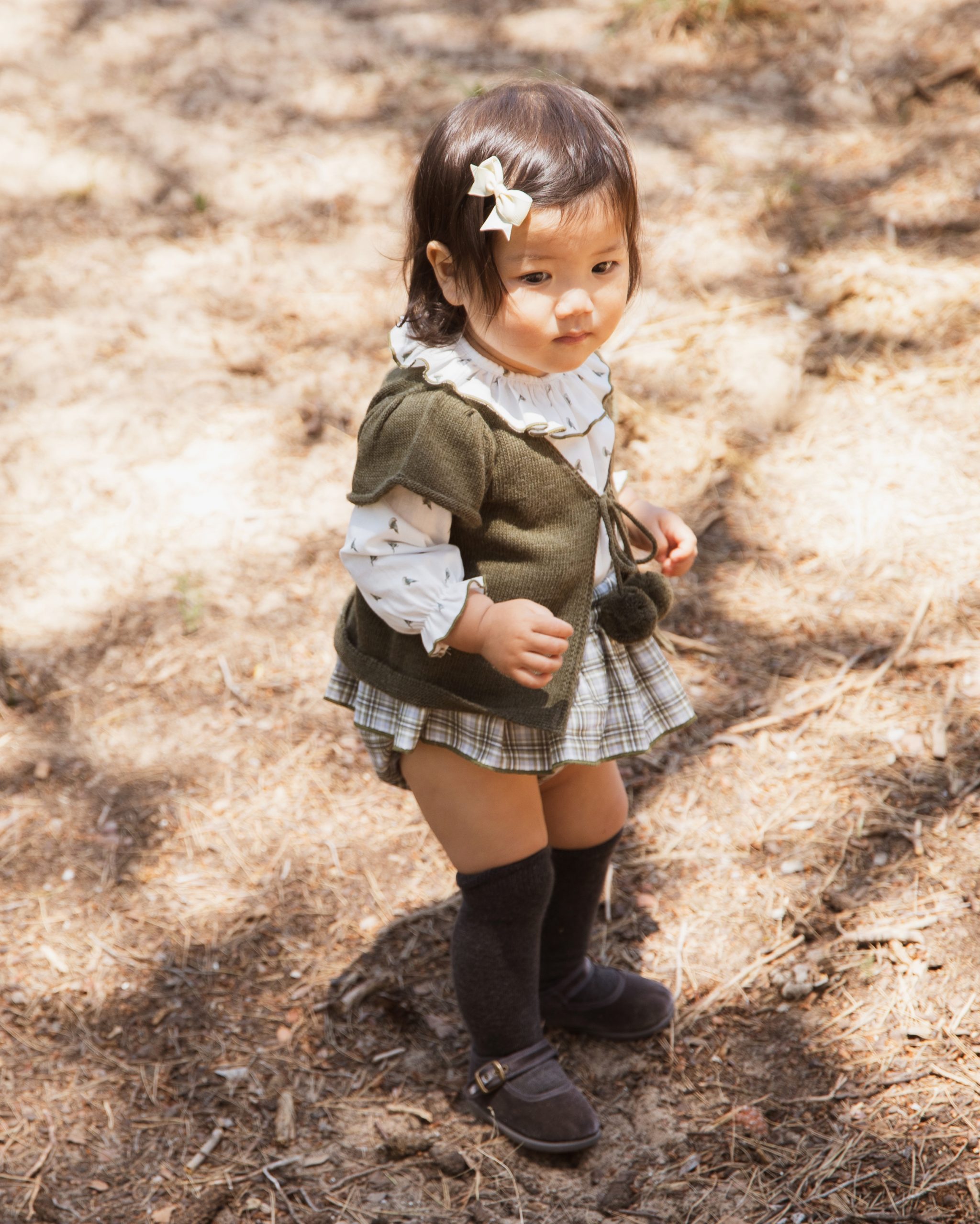 Conjunto formado por ranita tirantes con volante en tejido de cuadros, tonos grises y verdes, camisa tejido pajaritos con cuello redondo, ribete verde en cuello y puños. Chaleco verde oliva con pompón.