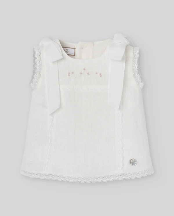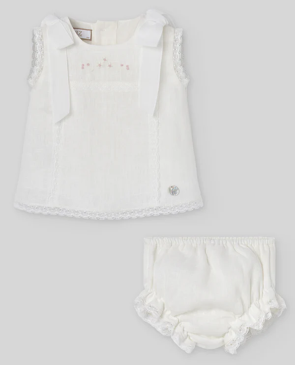 Conjunto para bebé niña de la colección “Alegra” compuesto por vestido corto de lino con detalles bordados y braguita coordinada.