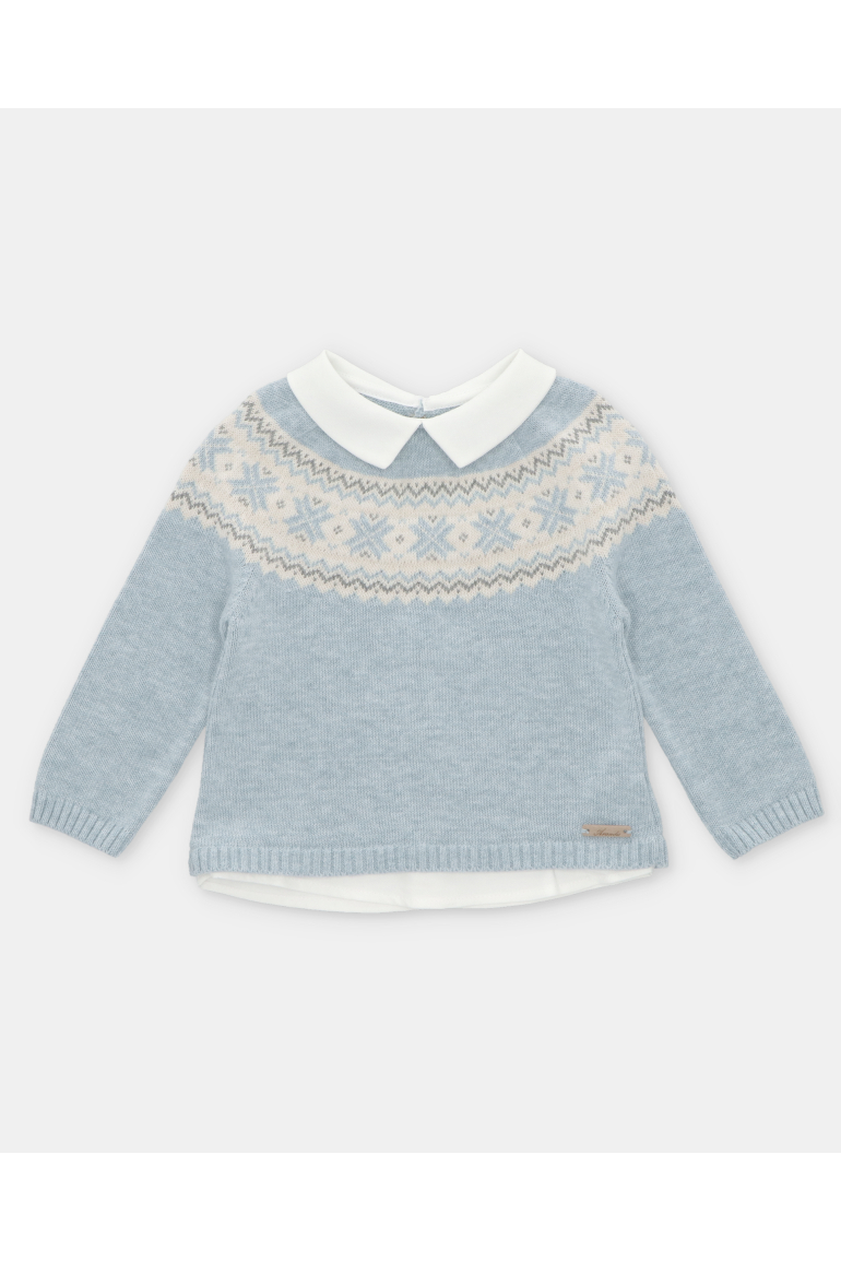 Jersey de punto color celeste con dibujo en cenefa de tonos camel, blanco y celeste.
