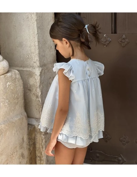 Vestido de ceremonia con braguita a juego color celeste. Manga corta con un pequeño volante y terminación del vestido bordado en color beige.