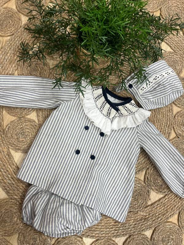 Vestido con braguita confeccionado en tejido de rayas en tono azul marino, tiene botonadura forrada de terciopelo a tono.