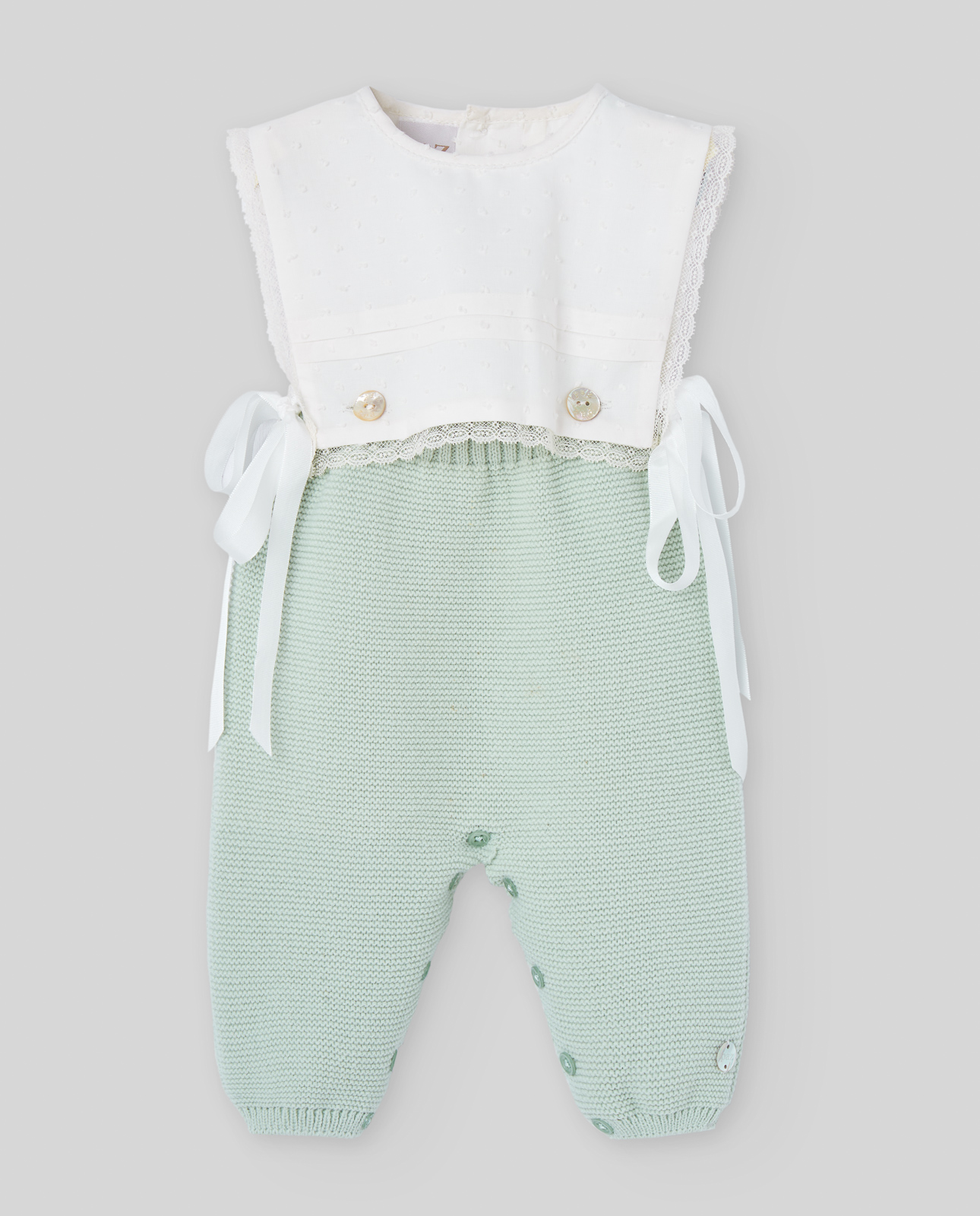 Pelele combinado de punto y tejido plumeti con detalle de encaje en los bordes y lazos a los lados. Perfecto para combinar con un body debajo.