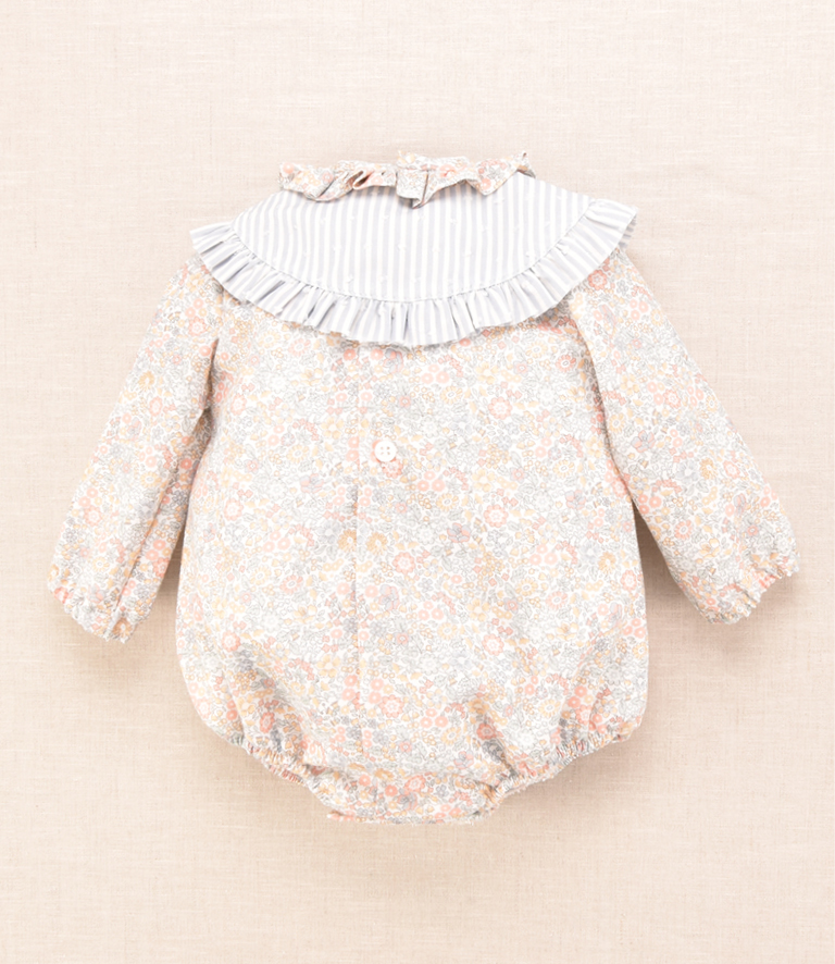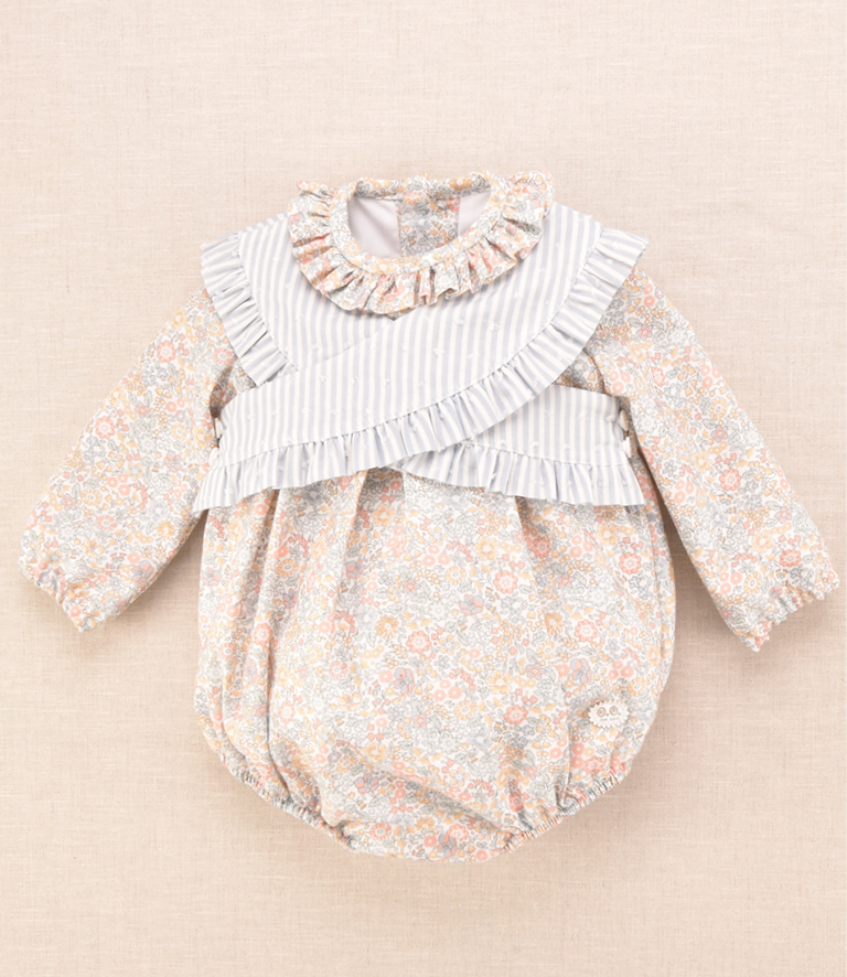 Pelele unisex estampado liberty y cuello desmontable cruzado en rayas celestes.