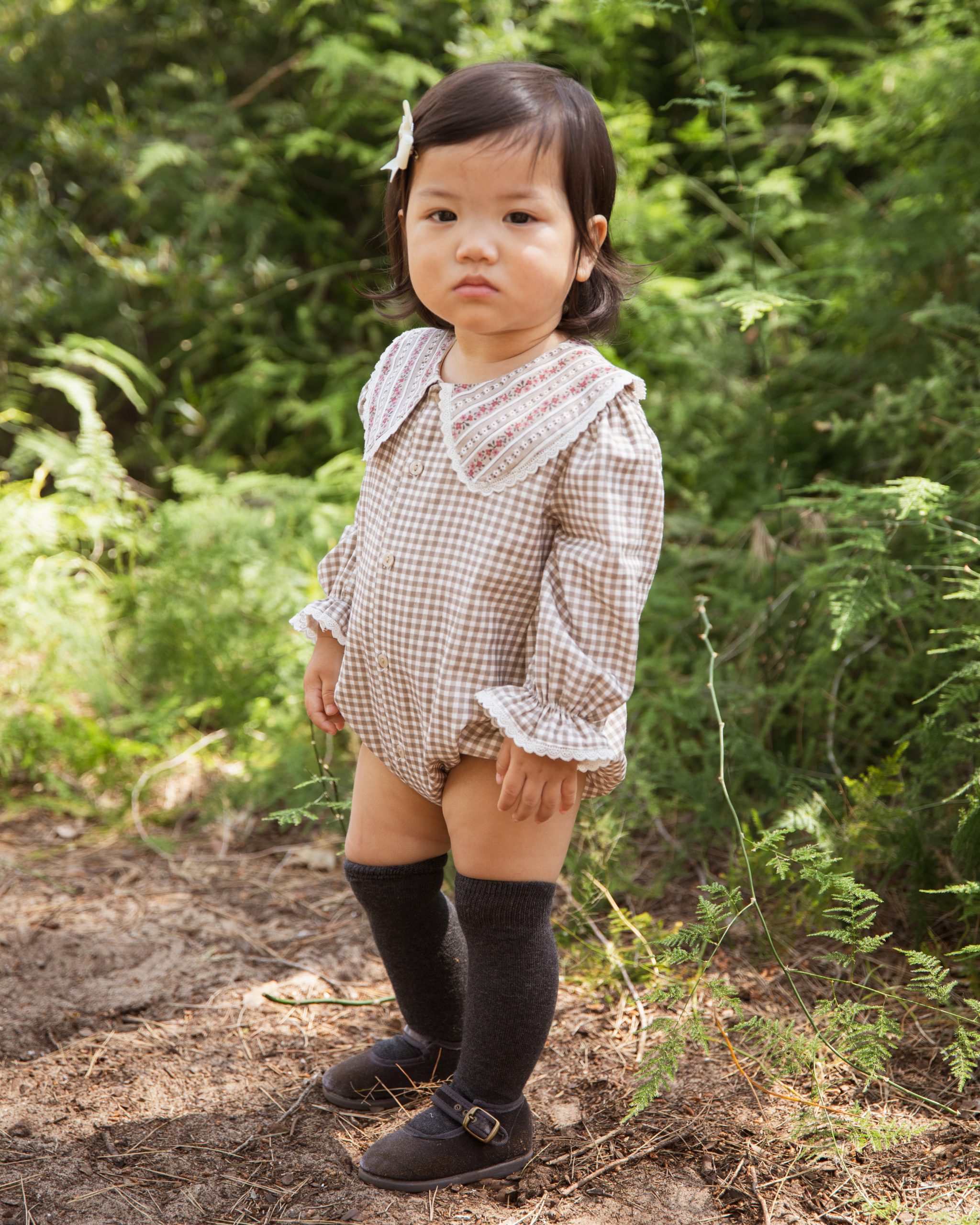 Pelele de manga larga confeccionado en tejido de cuadros vichy en tono marrón y blanco. Destaca su cuello bobo con detalle de rayas y pequeñas flores en tonos burdeos y beige, rematado con delicado encaje en el borde. Las mangas terminan con volante y puntilla, aportando un aire clásico y elegante.