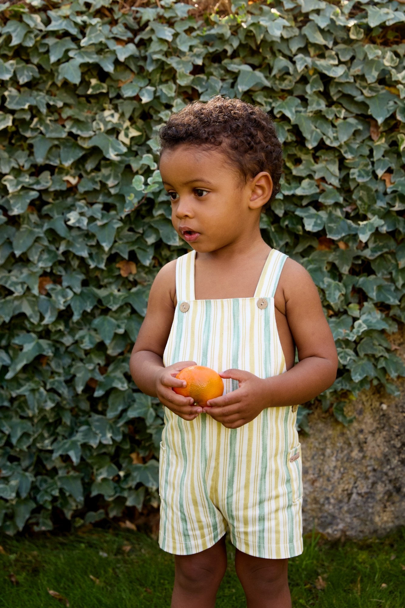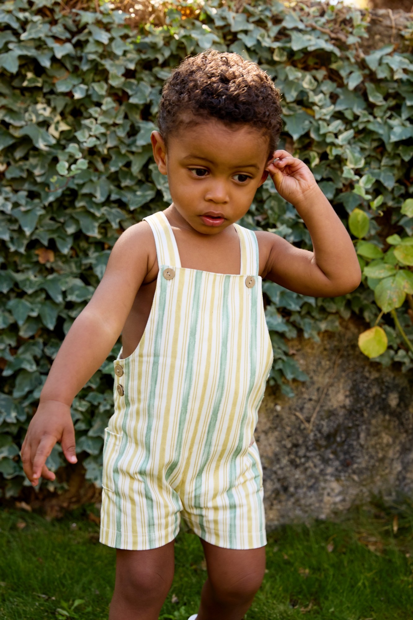Peto corto de niño confeccionado en tejido ligero de algodón 100 %, con estampado de rayas verticales en tonos verde agua y amarillo suave sobre fondo claro.
