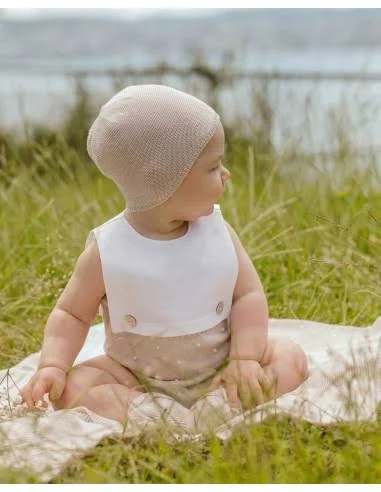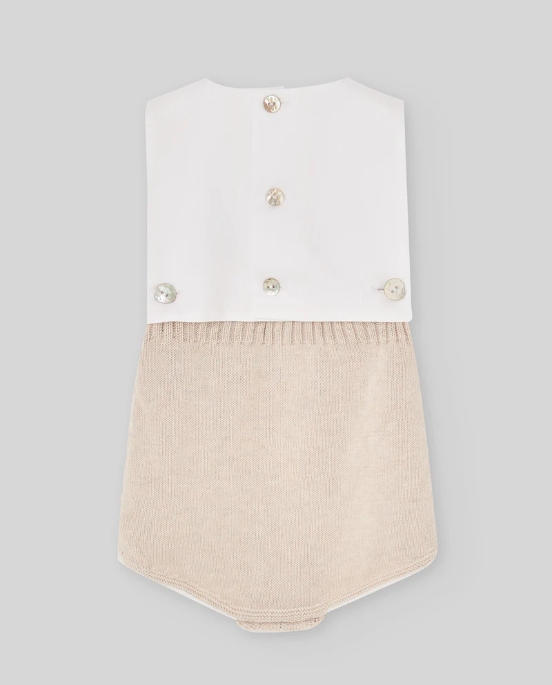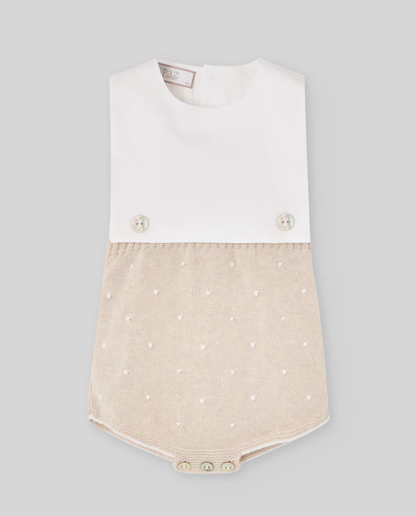 Ranita combinada de punto y tejido con parte superior lisa y parte inferior tricotada con pequeños topos, adornada con botones decorativos, de la colección “Néctar”.