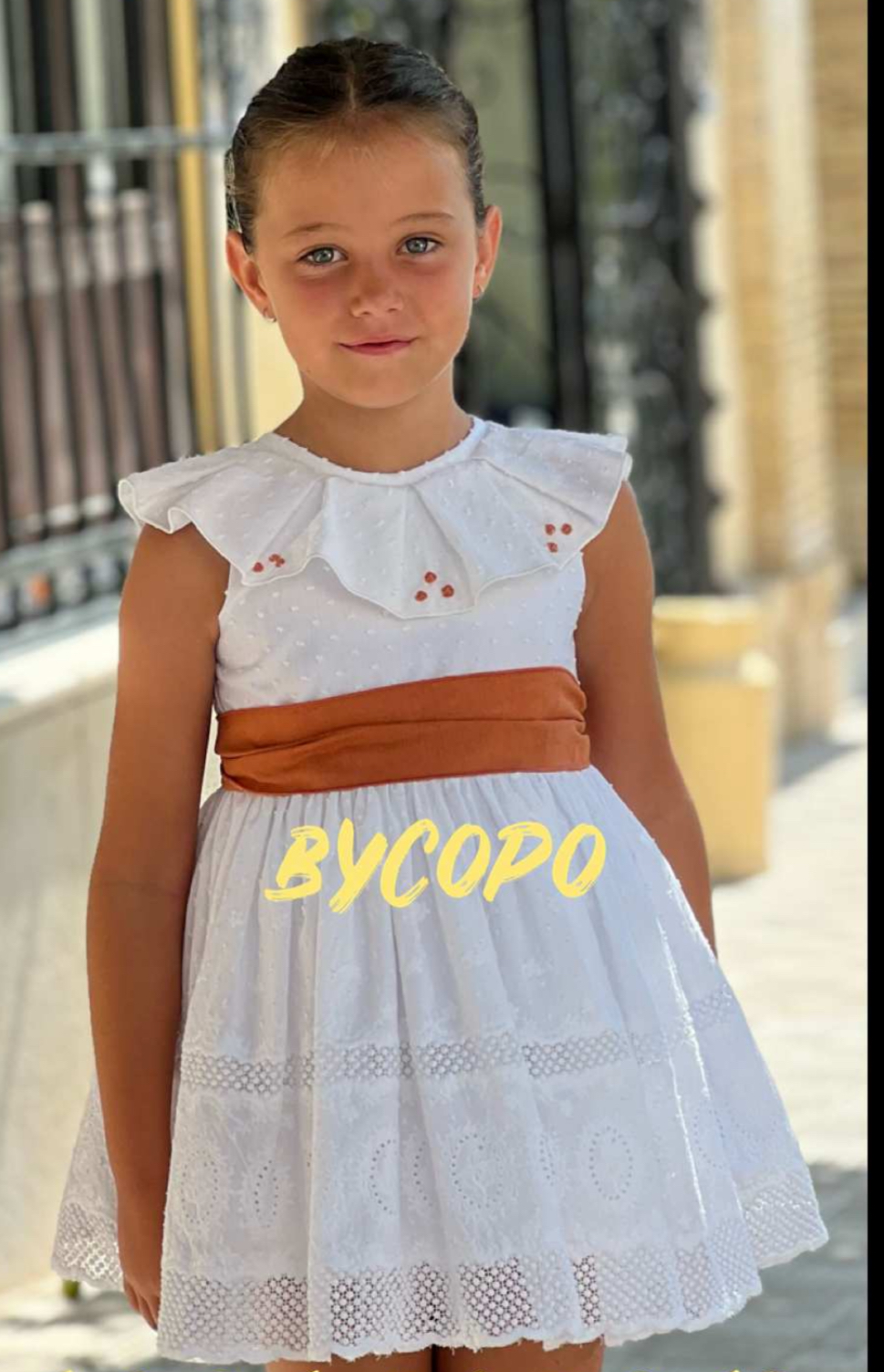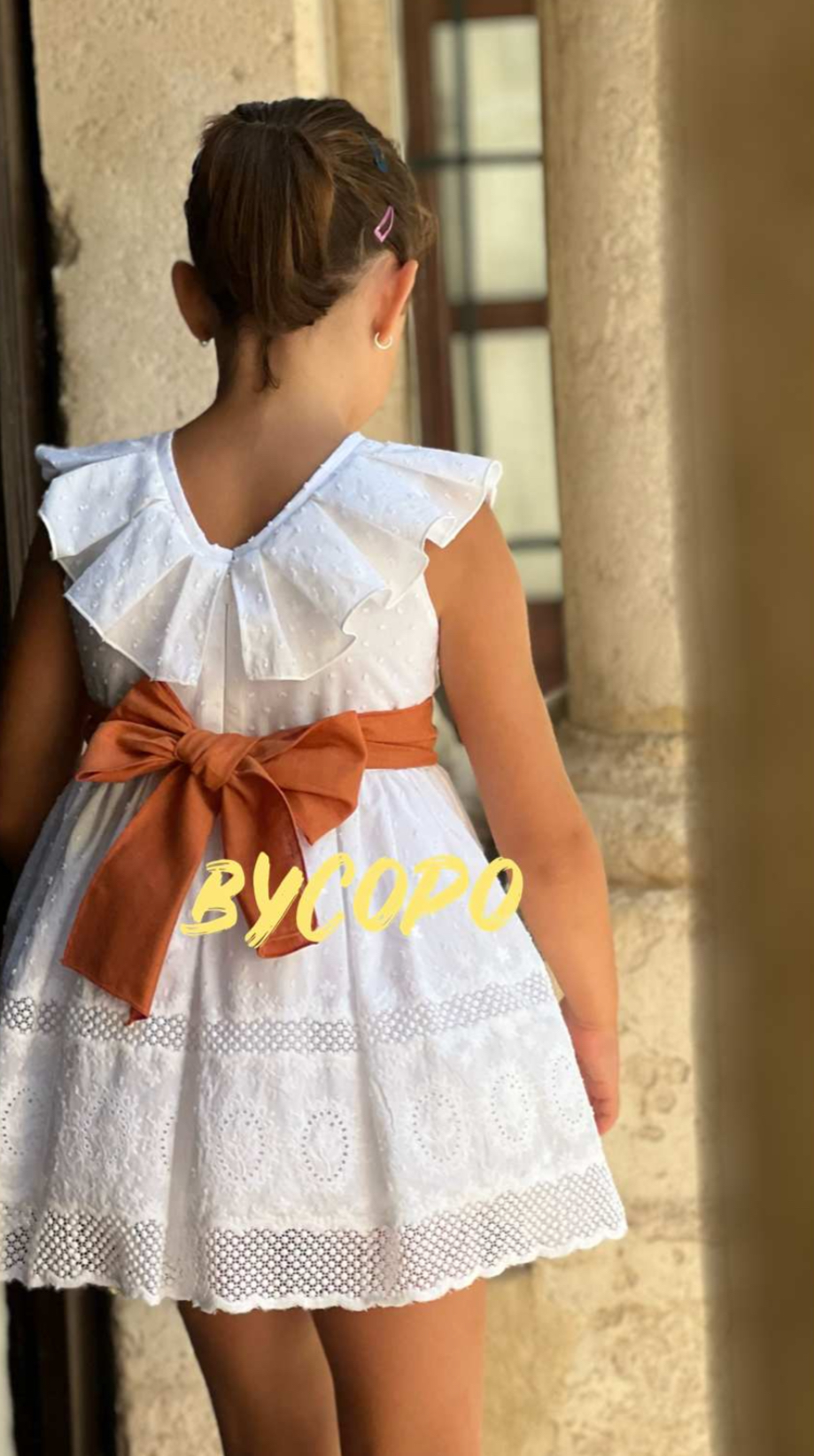 Vestido de ceremonia tejido plumeti blanco, cuello con volante bordado en color caldera y lazada a juego. Tiene espalda con escote V