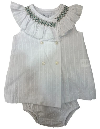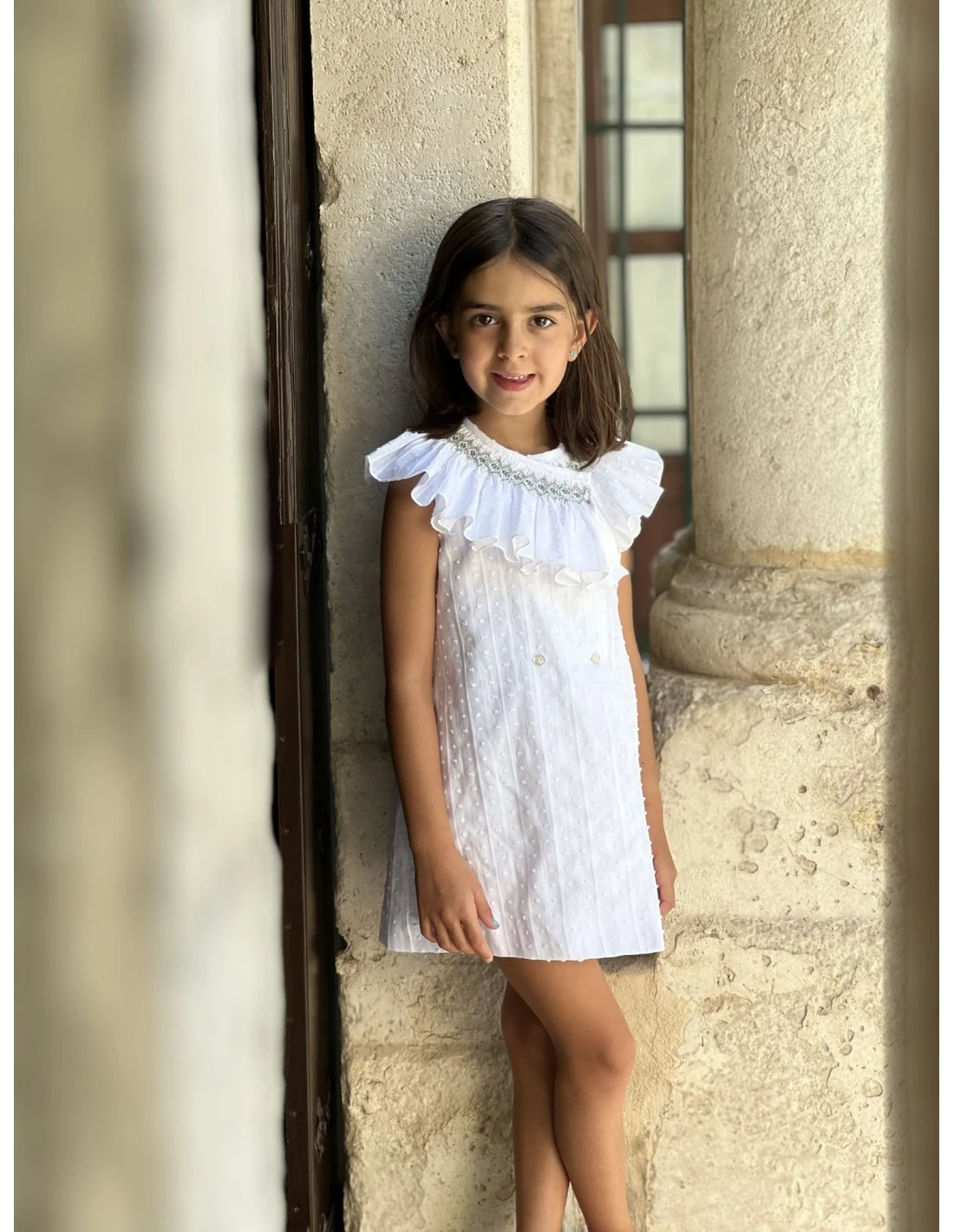 Vestido de plumeti en blanco de mangas a la sisa, con botones de doble pecho y cuello con nido de abeja en tonos verdes y beige.