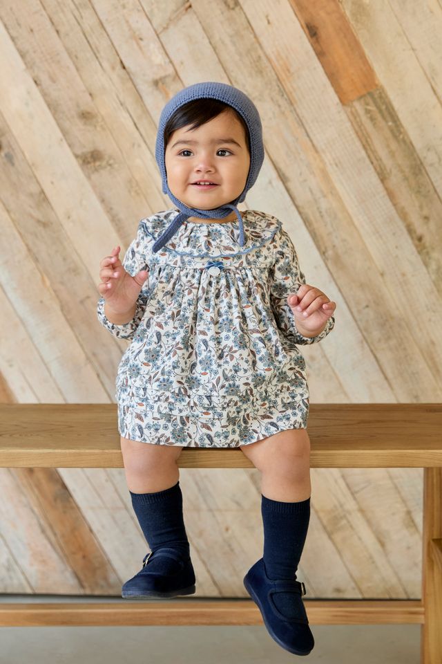 Vestido de tela estampado a juego con braguita. Detalle de volante en el cuello.
