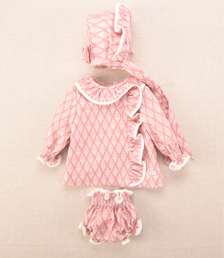 Tejido estampado rosa y blanco. Original detalle de volante en un latera del vestido, cuello volante y puños fruncidos.
