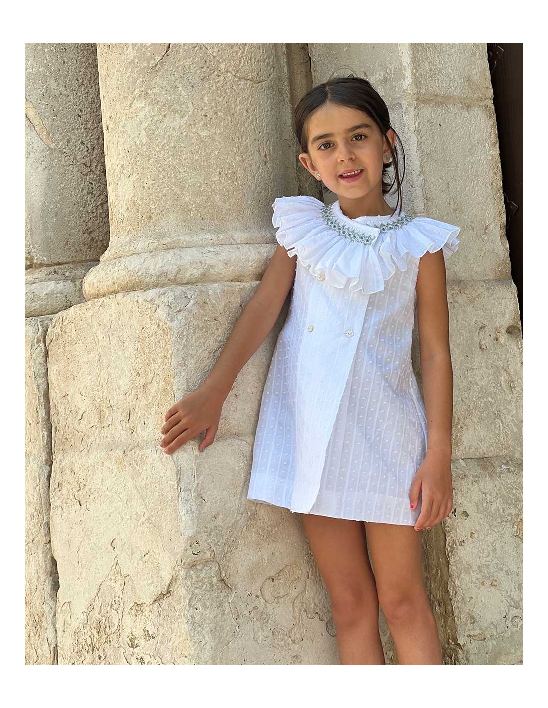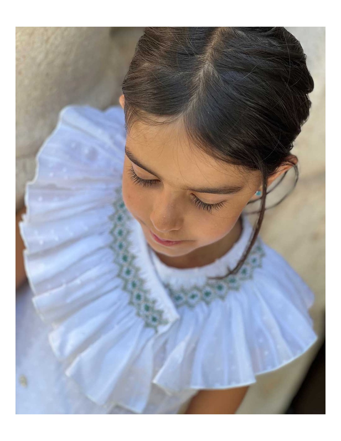 Vestido Niña Ceremonia Plumeti Blanco Cuello Fruncido Nido de Abeja