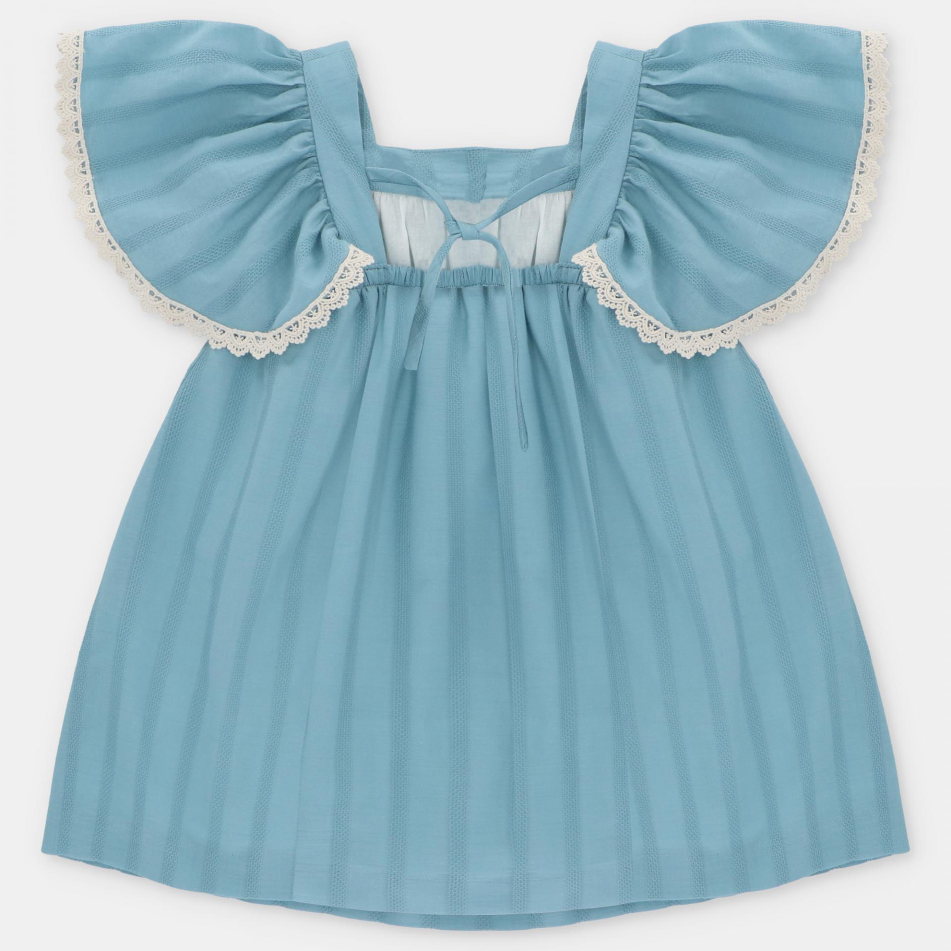 Envió Gratuito a partir de 50€Vestido de tela en azul, tiene manga de volante con detalle de puntilla cruda y espalda con lazo.